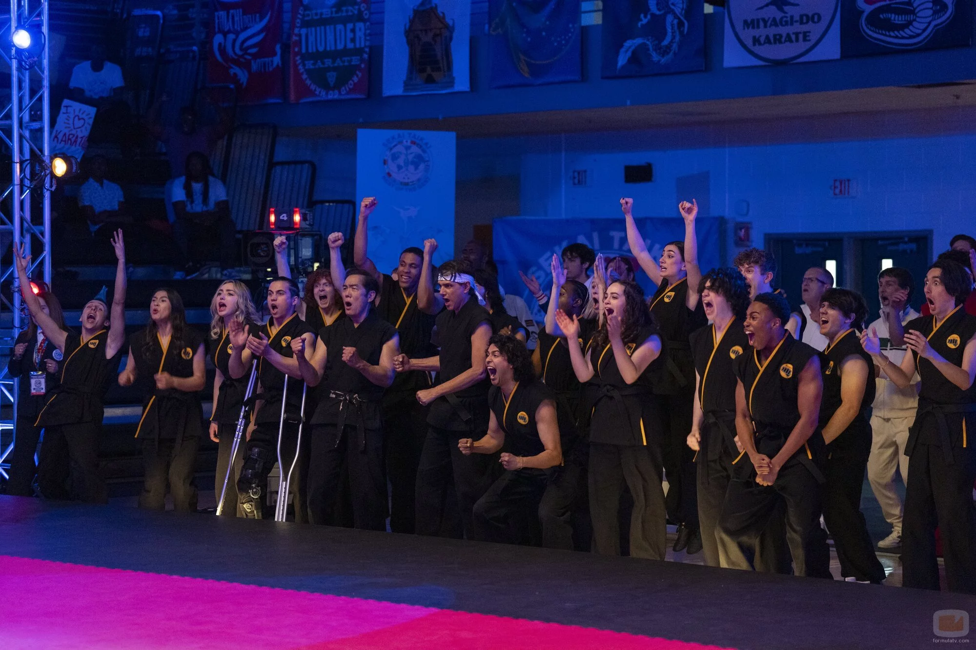 Tanner Buchanan, Jacob Bertrand, Ralph Macchio, Peyton List, Mary Mouser, Xolo Maridueña y Dallas Dupree Young aparecen en una escena del capítulo 6x15 de la serie 'Cobra Kai'.