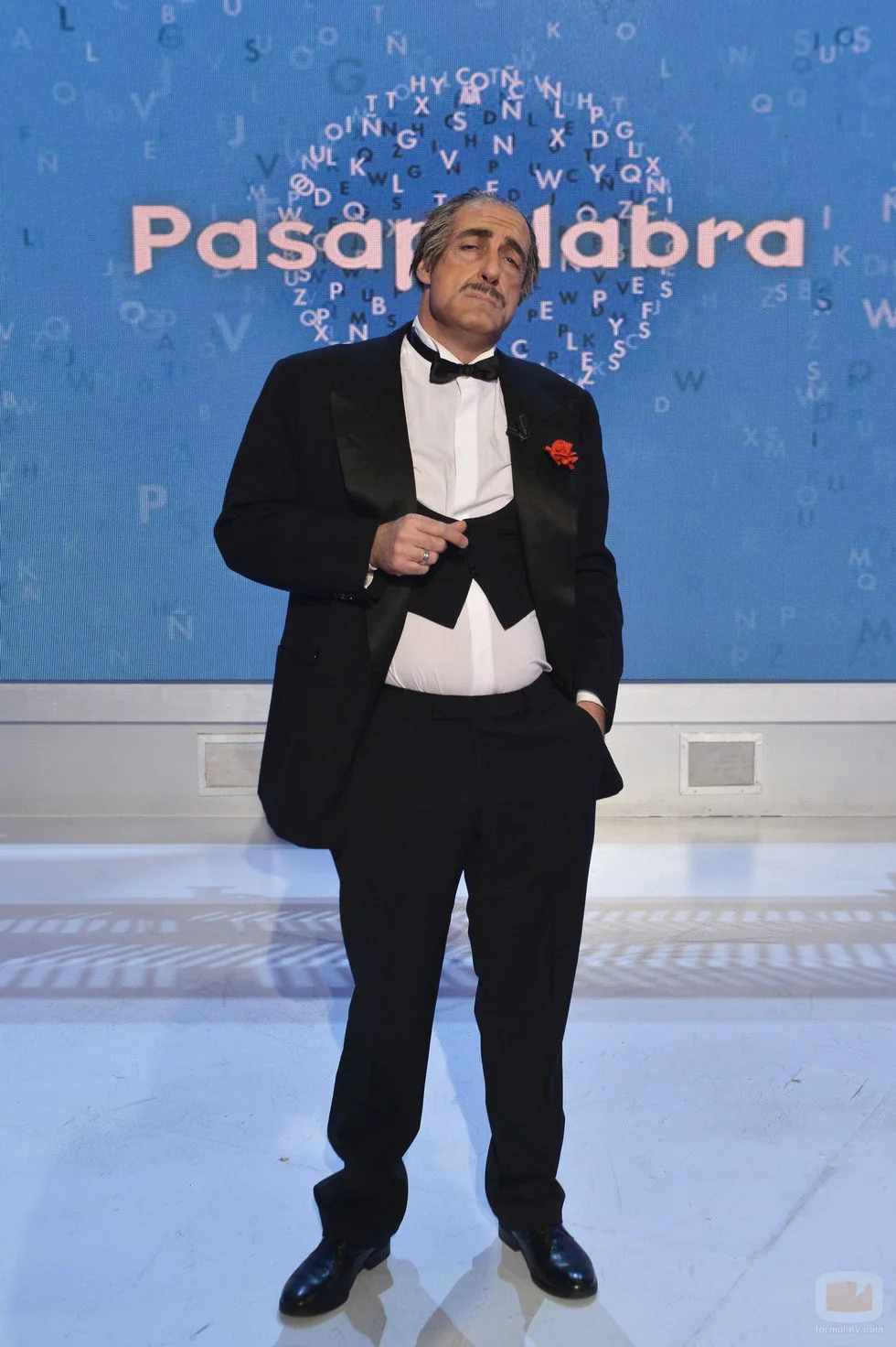 Felisuco se disfraza de Don Vito Corleone en el carnaval de 'Pasapalabra'. El actor luce envejecido de traje con la tradicional rosa roja para darle realismo al personaje.