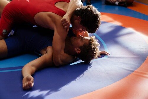 Imágenes de la octava temporada de 'Élite', la temporada final de la serie de Netflix, en las que Joel (Fernando Lindez) e Iván (André Lamoglia) realizan un combate de lucha libre.
