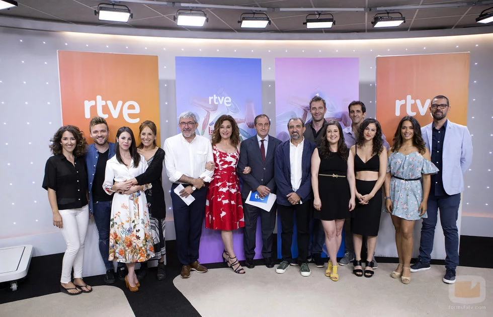 Todos los actores juntos; Chiqui Fernández, Juanjo Cucalón, Fernando Gil, Adam Jeziersky y Anna Grass entre otros, posan durante la promoción de la serie 'La Pelu' de La 1.