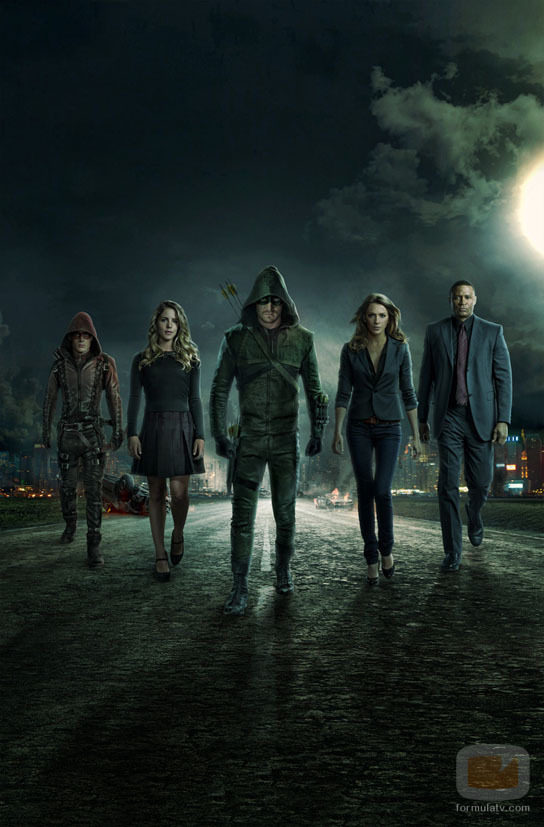 Foto de la tercera temporada donde aparecen Stephen Amell, Katie Cassidy, Colton Haynes, David Ramsey y Emily Bett Rickards.