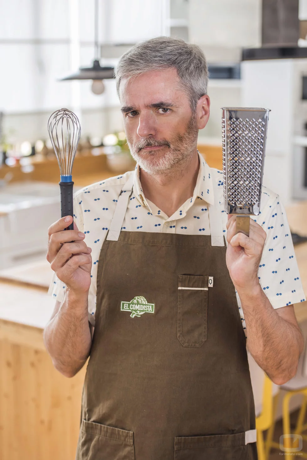 Mike López Iturriaga, conductor de 'El comidista', sostiene dos utensilios de cocina mientras aparece con rostro serio.