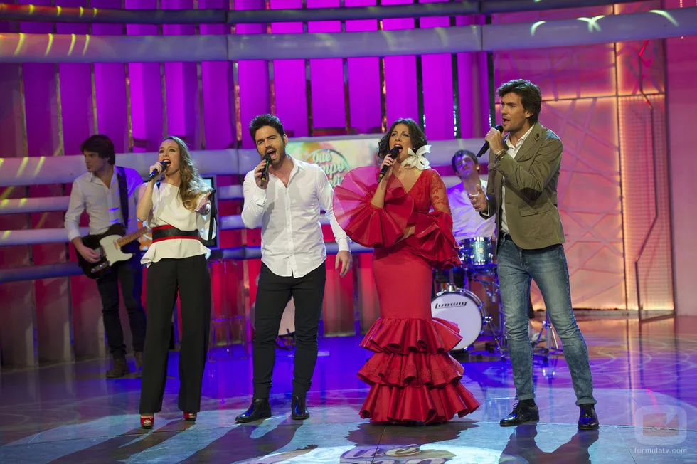 Fran Dieli (a la derecha), exconcursante de 'Operación Triunfo', aparece cantando en '¡Qué tiempo tan feliz!' junto a tres cantantes más.