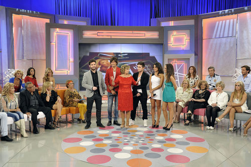 Fran Dieli aparece junto a María Teresa Campos y el resto de cantantes de '¡Qué tiempo tan feliz!'. Él se encuentra detrás de la presentadora, con chaqueta roja.