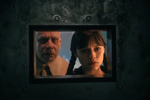 Fred Armisen y Jenna Ortega aparecen en una escena promocional del capítulo 'Si las tristezas hablaran' de la serie 'Miércoles'.