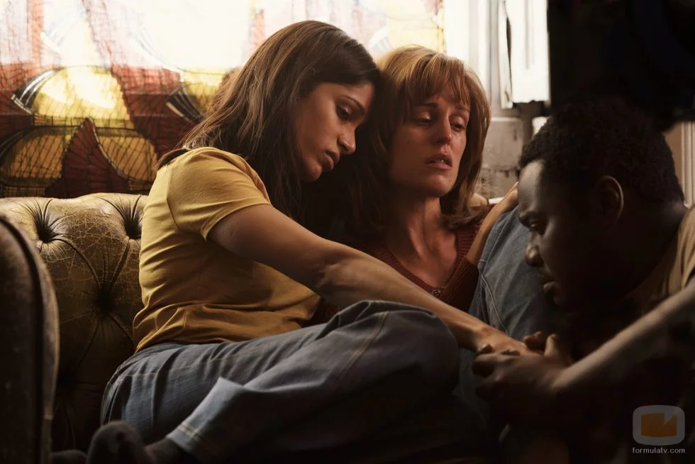 Las actrices Freida Pinto (izquierda) y Denise Gough (centro) se abrazan en esta escena de la serie de HBO 'Guerrilla'.