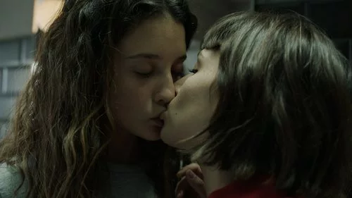 Una de las rehenes y la integrante del grupo de atracadores, interpretadas por María Pedraza y Úrsula Corberó, se besan en una imagen del sexto episodio de la primera temporada de 'La Casa de Papel'.