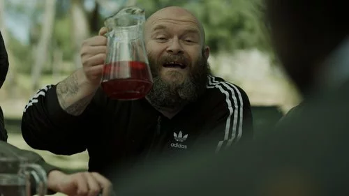 El actor Darko Peric se mete en la piel de Helsinki, que sostiene una jarra en la mano durante la comida de los integrantes del grupo de atracadores en una imagen del episodio 6 de la primera temporada de 'La Casa de Papel'.