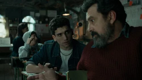 Los actores Jaime Lorente y Paco Tous como padre e hijo en una escena del thriller policiaco de Antena 3 titulado 'La Casa de Papel'.