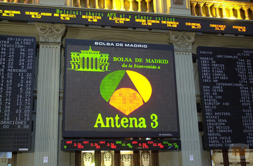 Momento en que la Bolsa de Madrid da la bienvenida a Antena 3 en el año 2003.
