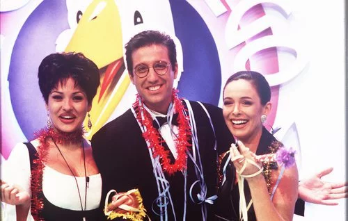 Patricia Pérez, Emilio Aragón y Lydia Bosch, sonrientes con adornos festivos en 'El gran juego de la oca', programa que comenzó a emitirse en 1993 en Antena 3 y, años más tarde, en Telecinco