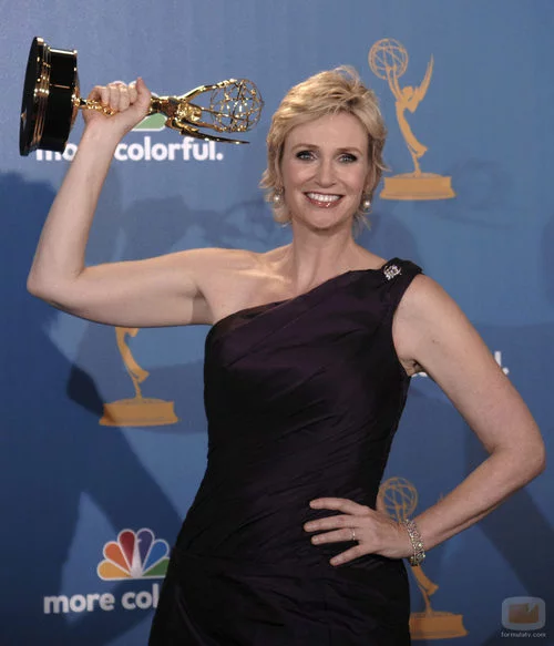Jane Lynch con su Emmy a la Mejor Actriz Secundaria de Comedia por interpretar a Sue Sylvester en 'Glee'.