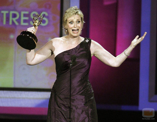 Jane Lynch recoge emocionada su Emmy a la Mejor Actriz Secundaria de Comedia por 'Glee'.
