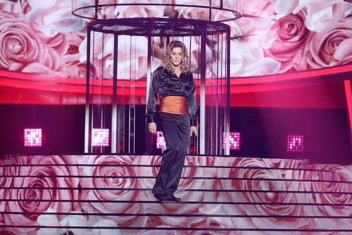 El concursante de la sexta edición de 'Tu cara me suena' baja las escaleras durante su imitación de Celine Dion con el tema "Tell Him".