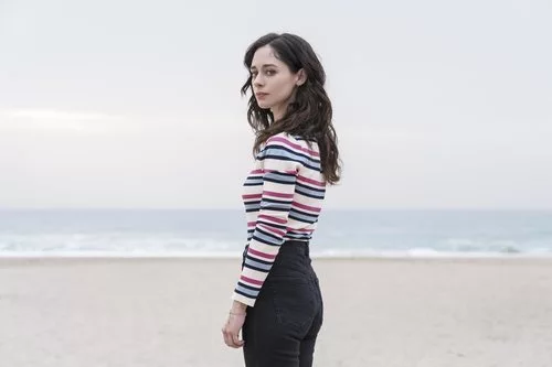 Elena Rivera, Alba en la ficción, posando de lado en una plata con el mar de fondo en la nueva ficción de Antena 3 basada en 'Fatamagül'.
