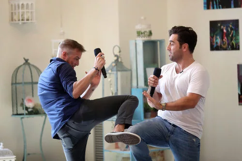 Àlex Casademunt y David Bustamante en las grabaciones de 'OT. El Reencuentro', un documental que reunirá a los concursantes de la primera edición del concurso.
