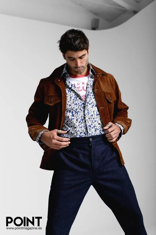 El actor canario Alex García, con cazadora marrón y camisa estampada con palomitas de maiz posando para la revista Point