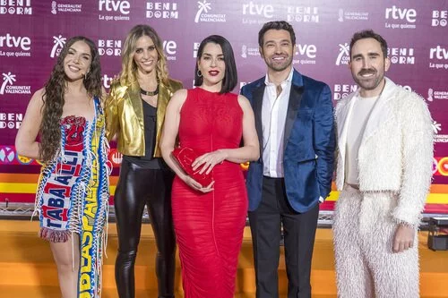 Los presentadores del Benidorm Fest 2024 en la alfombra naranja