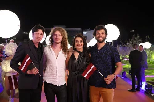 El dúo Carousel, representantes de Latvia, asisten junto a su equipo a la alfombra naranja de Eurovisión 2019.