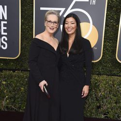 Meryl Streep y Ai-Jen Poo posan en la alfombra roja de los Globos de Oro 2018