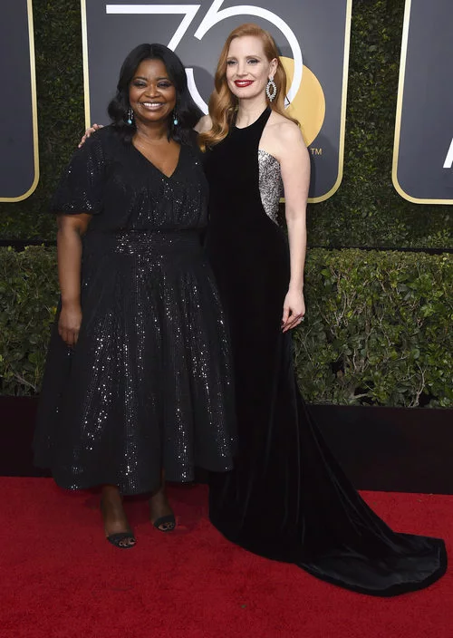 Octavia Spencer y Jessica Chastain posan en la alfombra roja de los Globos de Oro 2018