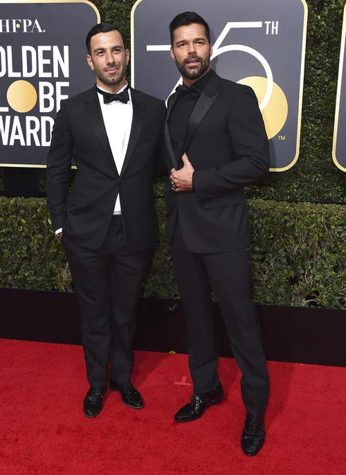 Ricky Martin posa junto a su pareja en la alfombra roja de los Globos de Oro 2018