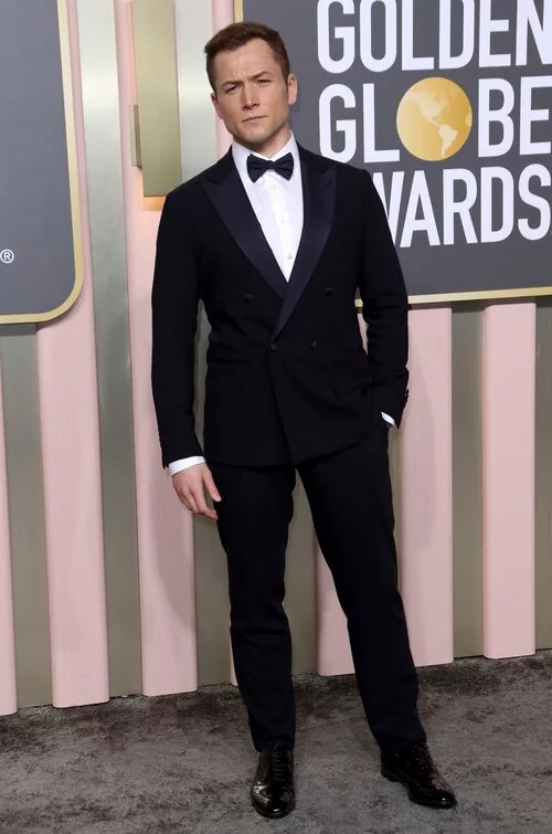 Taron Egerton posa en la alfombra roja de los Globos de Oro 2023