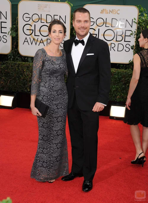El actor de 'NCIS: Los Angeles', Chris O'Donnell, junto a su pareja, Caroline Fentress, a su llegada a la alfombra roja de los Globos de Oro 2014.