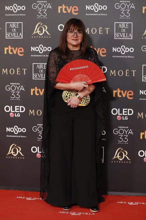 Isabel Coixet, la directora de "La librería", una de las películas destacadas de los pasados premios, posa con un abanico reivindicativo en la alfombra roja de los Premios Goya 2019.
