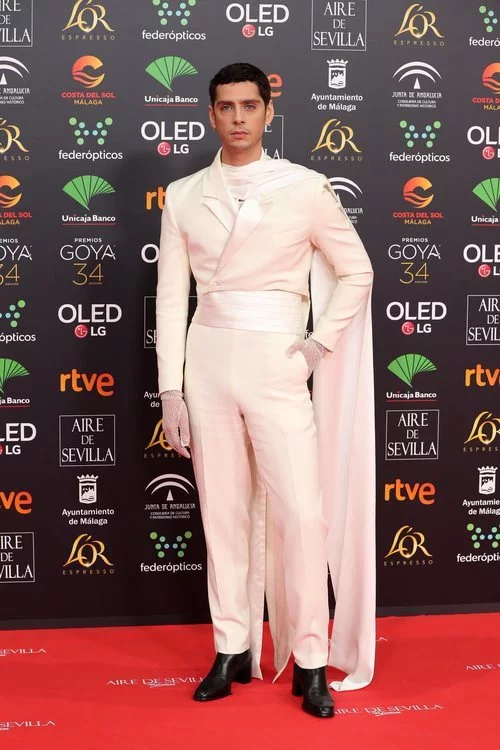 El actor Eduardo Casanova al que hemos podido ver en la segunda temporada de 'La casa de las flores' de Netflix o 'Arde Madrid' de Movistar+, posa con un vestuario totalmente blanco en los Premios Goya 2020.