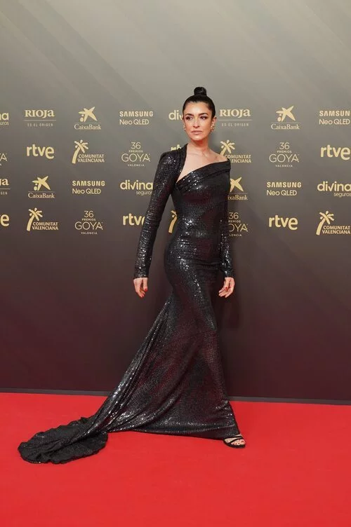 La actriz asturiana apuesta por un espectacular vestido negro de cola en la alfombra roja de los Premios Goya 2022.