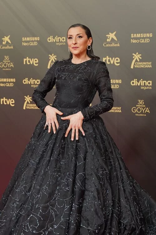 La actriz de 'Señoras del Hampa' posa con un voluminoso vestido negro ante las cámaras de la 36ª edición de los Goya.