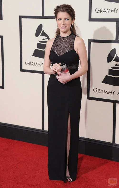La actriz Anna Kendrick fue otra de las invitadas de honor en los Premios Grammy 2016, y posó en la alfombra roja con un vestido negro con transparencias.