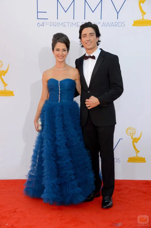 El actor Ben Feldman, Michael Ginsberg en la serie 'Mad Men', posa con su pareja en la alfombra roja de la 64 edición de los Premios Emmy 2012 en Los Ángeles.