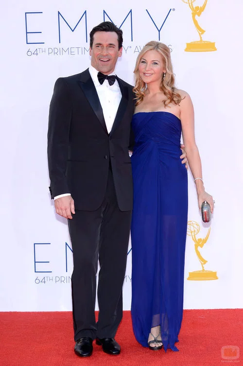 El actor de 'Mad Men', Jon Hamm, junto a su pareja Jennifer Westfeldt, en la alfombra roja de los Emmy 2012 en el Teatro Nokia de Los Ángeles.