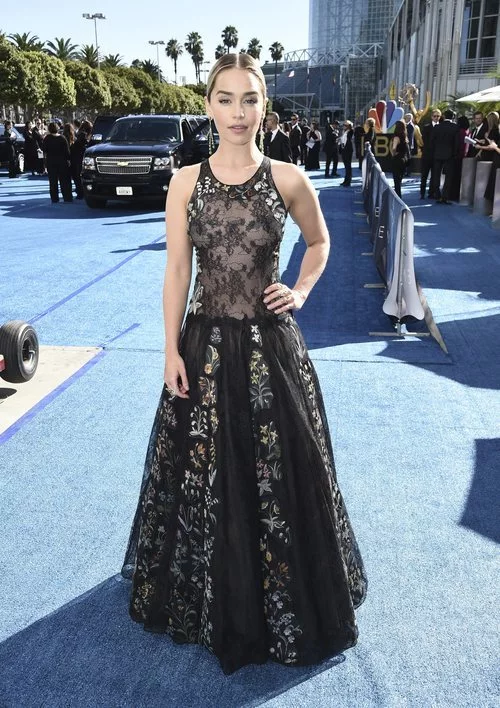Emilia Clarke, una de las actrices protagonistas de 'Juego de Tronos' posa en la alfombra roja con un vestido que mezcla encaje, transparencias y flores.