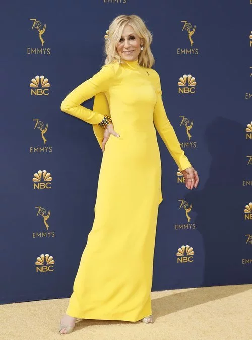 Judith Light, una de las nominadas a mejor actriz de reparto en una miniserie, posaba con este bonito vestido amarillo en la alfombra roja.