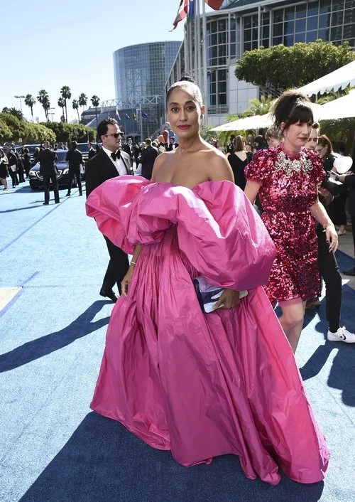 Tracee Ellis Ross, quien está nominada a mejor actriz de comedia por su papel en 'Black-ish', ha lucido este extravagante vestido rosa en la alfombra de bienvenida.