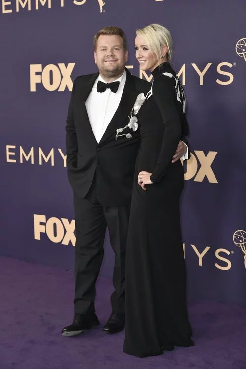 El presentador de televisión James Corden posa sonriente junto a su esposa Julia Carey en la alfombra roja de los Premios Emmy 2019.