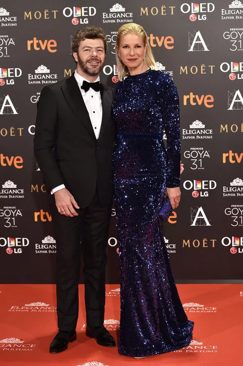 La presentadora de Televisión Española Anne Igartiburu posa con su pareja con un espectacular traje de Lorenzo Caprile en los Goya 2017.