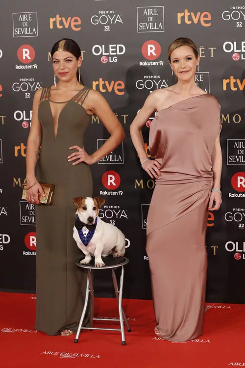 Las actrices posan con Pancho, el protagonista de 'Sabuesos', durante la Alfombra Roja de los Premios Goya 2018.