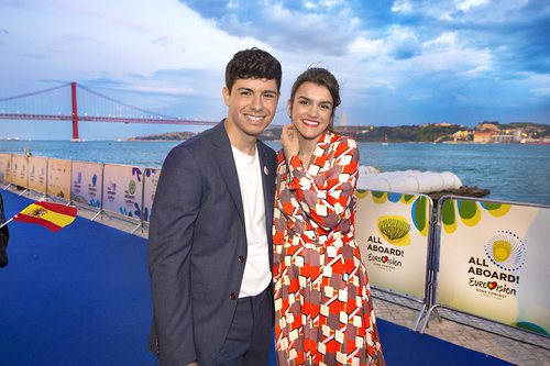 Amaia y Alfred brillan en la inauguración de la 63ª edición del Festival de Eurovisión. En la foto podemos verlos posar con el puente del 25 de abril al fondo.