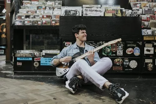 Alfred García posa con su guitarra eléctrica en una tienda de discos