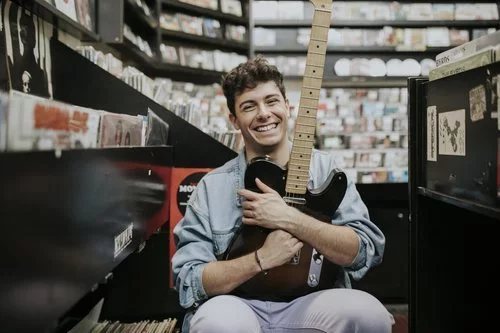Alfred García con su guitarra eléctrica en una tienda de discos