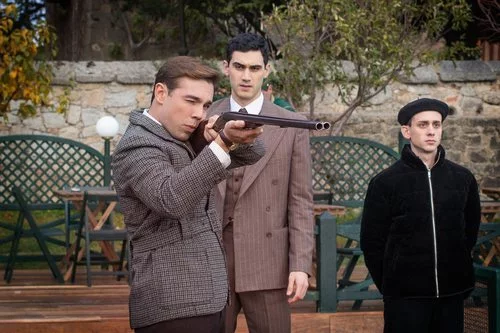Alonso (Carlos Cuevas) apunta con una escopeta en presencia de su buen amigo Gabino (Alejandro Speitzer) en 'Alguien tiene que morir'.