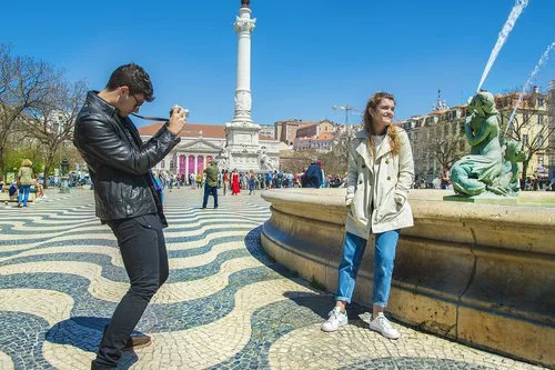 Alfred fotografía a Amaia en la Praça do Rossío de Lisboa