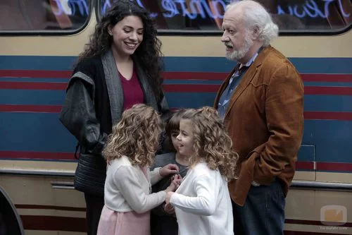 (17x10) Paquita (Ana Arias) y Miguel (Juan Echanove) conversan a los pies del autocar que llevará a los vecinos de San Genero a Lourdes.