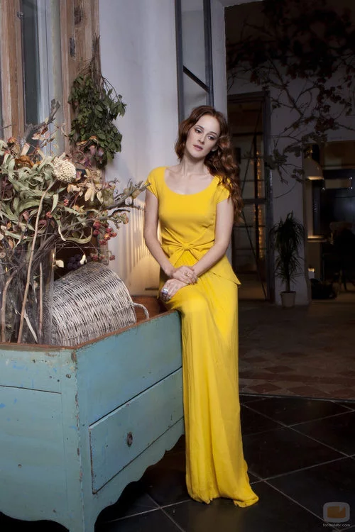 Ana Polvorosa con un traje amarillo de Miriam Oscariz para la revista Lanne.