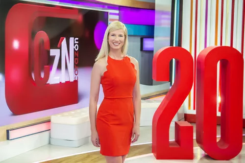 Anne Igartiburu posa vestida de rojo en el plató del programa 'Corazón', el cual cumple 20 años en emisión en La 1.