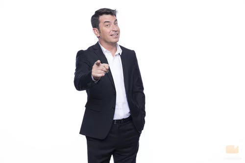 El presentador de 'Me resbala', el nuevo concurso de Antena 3, posa apuntando con el dedo ante la cámara.